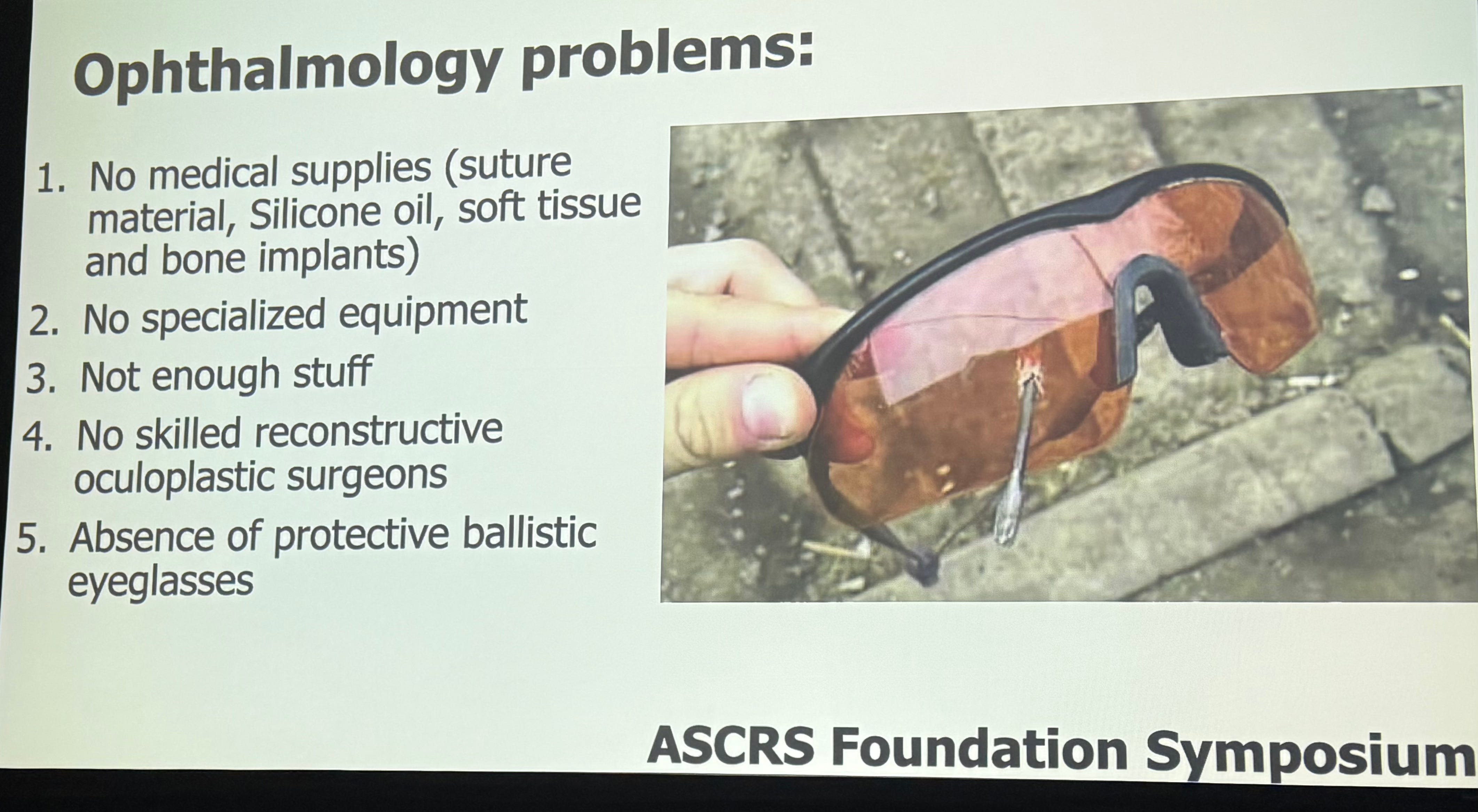 I was amazed to see this slide at the 2025 ASCRS Foundation Symposium. Eye injuries are six times higher, compared to WWII in the Ukraine war for many reasons. Chief among them are visually guided Russian/Iranian/North Korean drones attacking during daylight hours.